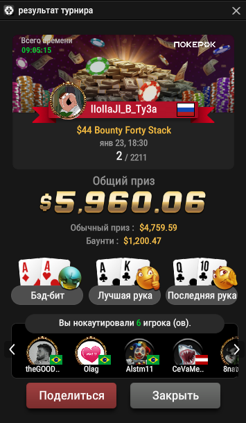 Как уже писал выше, я перешёл с игры день-вечер на игру в прайм-тайм. Играя прайм я понял, что МТТ покер это не просто марафон, а марафон в кубе. В итоге было принято решение перейти со своего ролла на фулл бекинг, т.к. мой ролл с большой долей вероятности мог бы не пережить игру в прайм. Да, теперь я отдаю практически половину от выигрыша, но зато чувствую себя абсолютно спокойно. Полностью вывел БР и знаю что есть средства для жизни на год вперед. Не переживаю по поводу истощения БРа, а в игре чувствую себя максимально раскрепощенно. Так что считаю это абсолютно верным решением.