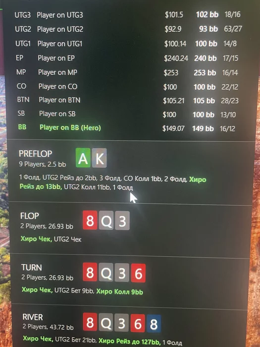 Последняя: 8бб на сб. Все пас, я пуш , ББ колл по , аут.