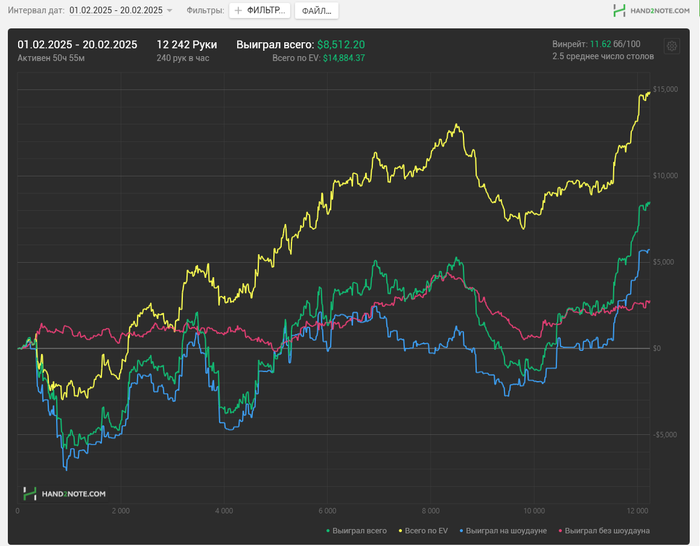Удалось поиграть прям высоко в этом месяце, сыграл несколько сотен рук на 5к и даже чутка поиграл 10к с фишом.