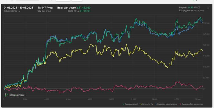 Наконец-то дошли руки написать отчет по марту. Сыграл не оч много рук, буду пытаться выдавать побольше дистанцию, но из плюсов качество игры думаю что выросло.