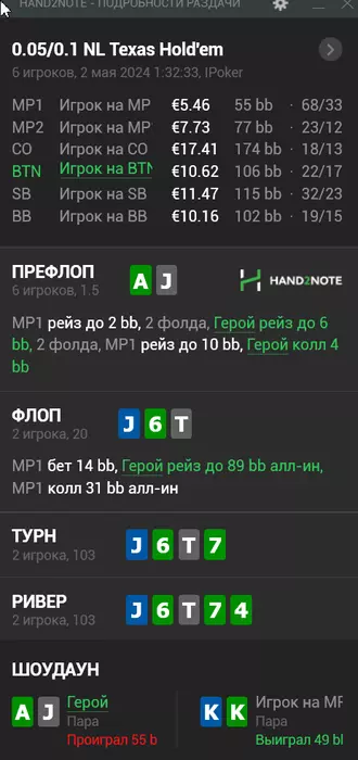 с АJс, где в трибетпоте опп-рейзер зачекал почему-то флоп на J25. Его бы статы глянуть.что там с конбетами, что там с ввсф и тому подобное. Не нравится его сайз рейза на терне, слабостью видится. Ну и ривер, где ничего не закрылось он пушит. Сам возможно бы отбивал.