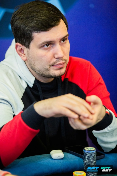 В последней раздаче перед перерывом выбыл Дмитрий Беликов. Поставил олл-ин 280к в открытие Сергея Коновалова и поехал снизу с в .
