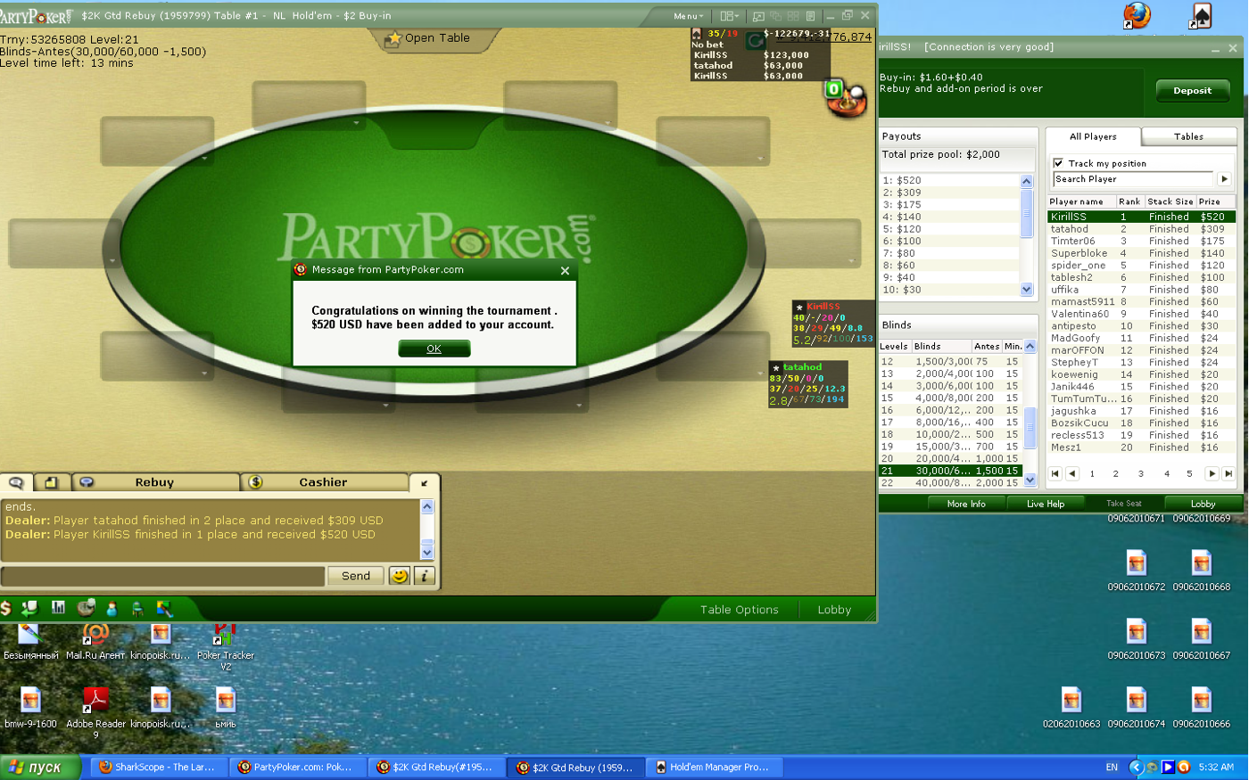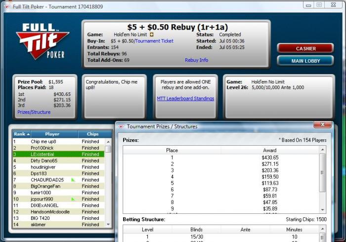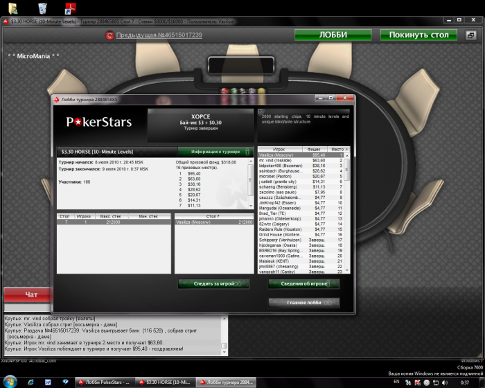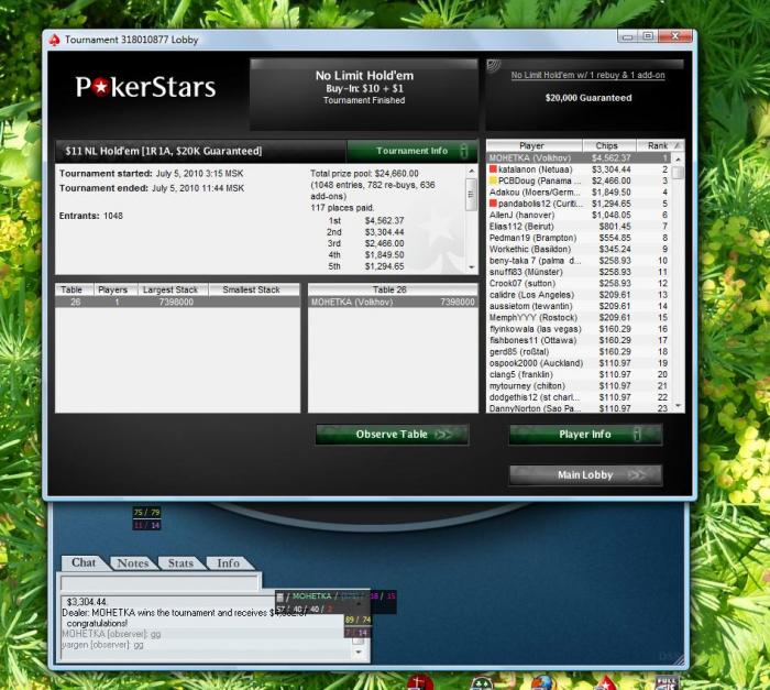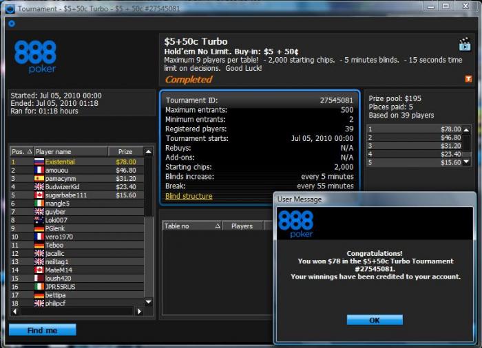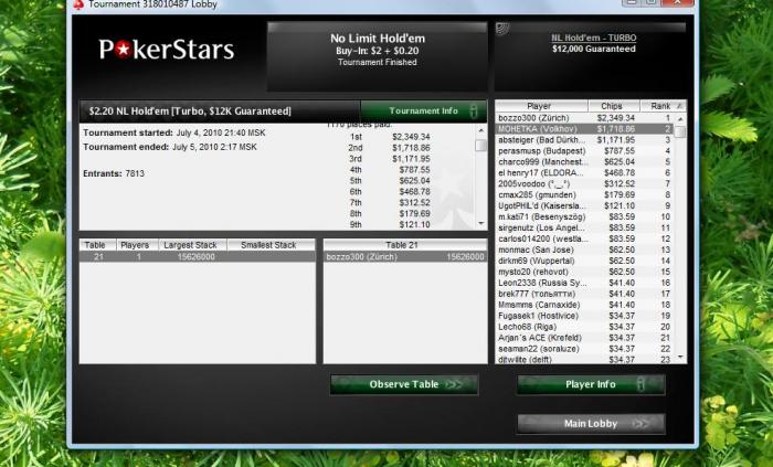 2087 игроков(а)Общий призовой фонд: $16696.00 USDТурнир начался 04.07.2010 0:00:00 MSK [03.07.2010 16:00:00 ВВ]Уважаемый(ая) MANEYHOLDEM$,Вы заняли на турнире 2 место