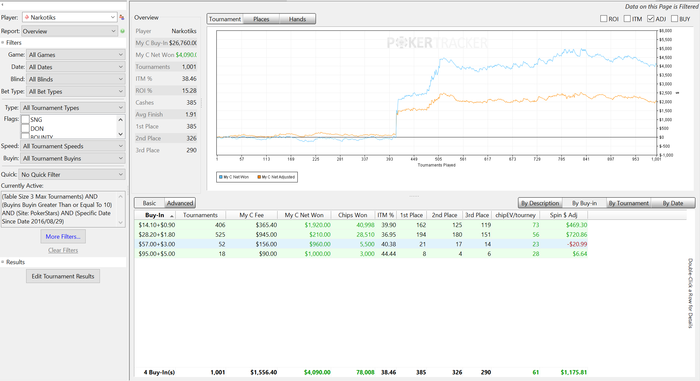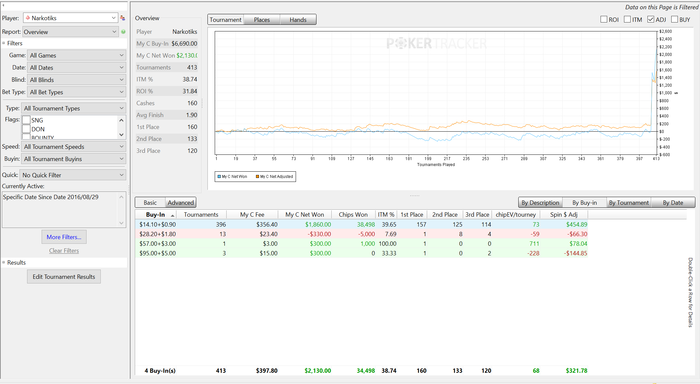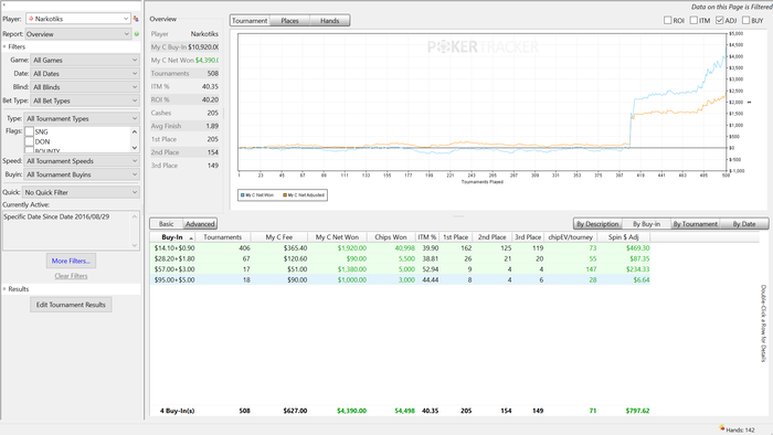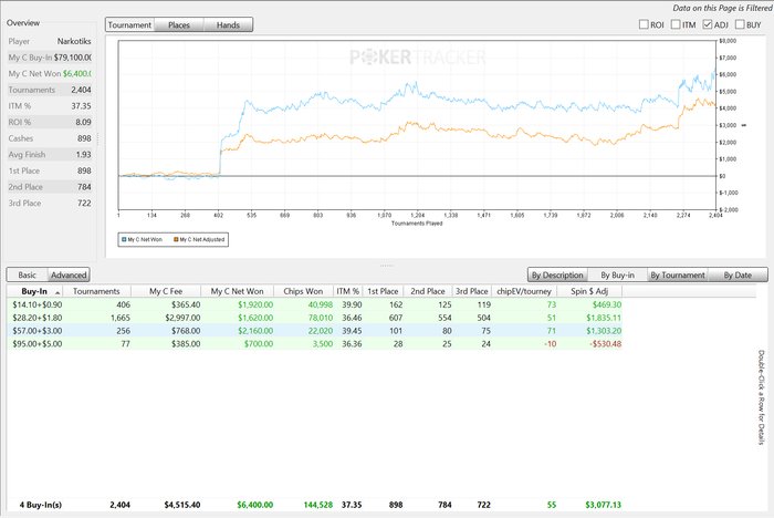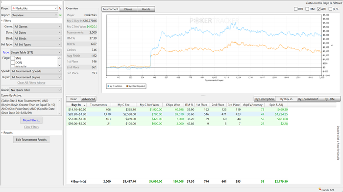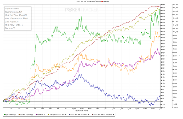 Еще 700 с лишним турниров в ноль. Качество игры падает с постыдной скоростью. Я застрял в промежуточном стиле. Надо либо играть мало и вдумчиво, как обычно, либо турниров по 200 в день на автомате. А я ни там ни тут. Играю немного и с недостаточной концентрацией. И вообще в эти дни нет вкуса к игре - отщелкиваю кнопки, чтоб набить дистанцию. График скринить лень, отыграл 1737 турниров, ЧипЕв упал до позорных 59. Профит 4К, спин-профит 2.5К.
