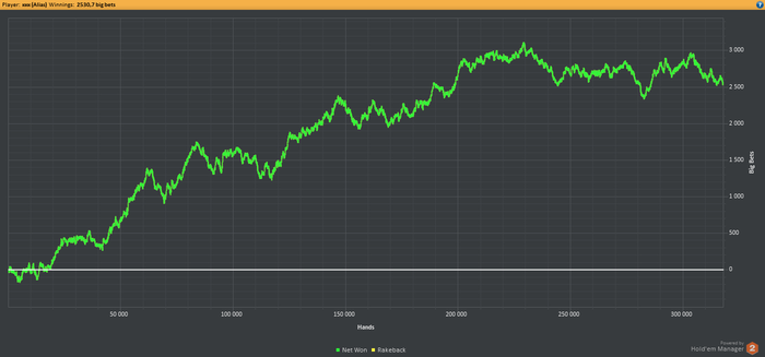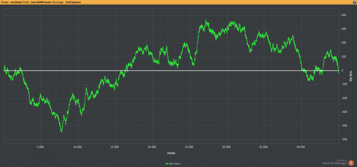 я хз так так выходит, но все время во время игры в говнорумах Ваш график выглядит как будто вы лудос и сражаешься с уберрегами, а не играете с 3-4 фишами за столом. Например ай покер, да рук мало на этом компе. Ну когда вы играете в лхе в хороших составах, даже на таких дистанциях график должен быть иным(или не должен) как будно в нл играю)