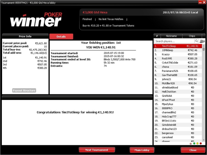 Вчера опять удалось выиграть хэксу:) Еще было 3е в сотке винамакса обидное, и еще более обидное 10е в бенжамине)