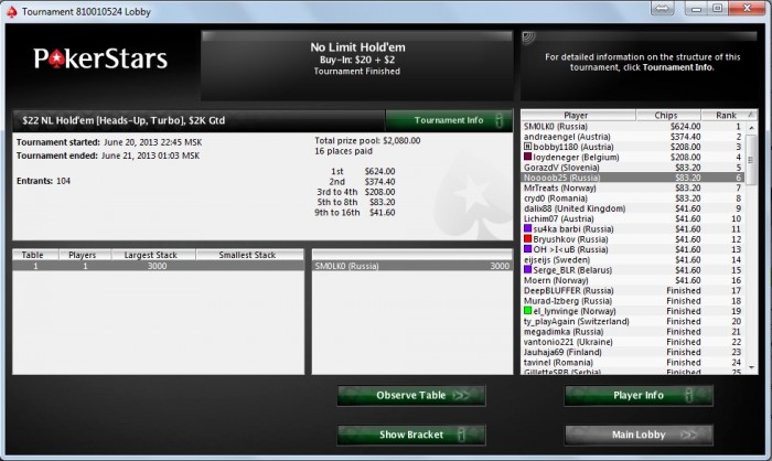 3) Не ужасен уж. Хотелось изобразить дрова с попаданием в терн или с гатшотом. получить проплату с Аx. Честно говоря в целом старался быть как можно более нестандартным. Просто хотьь как-то вывести его из равновесия. Я понимаю, что пока не очень получается. Но он же меня проблаффкэтчил со стритом, где у меня фул. Все из-за идиотского розыгрыша с виду.