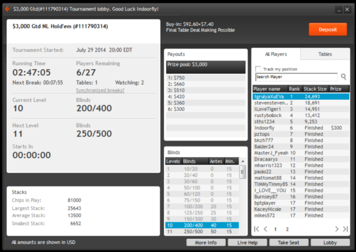 Перед туриком поиграл пару часов кеш 1/2. Сел за стол, а там все оппы 20-35 лет. Бля, думаю, интернетчики, надо валить. Оказалось совсем нет. Даже я со своим убогим постфлоп скиллом смог там нажить. Выкинул АК на 4бет в открытую, опп расстроенный показал тузов.