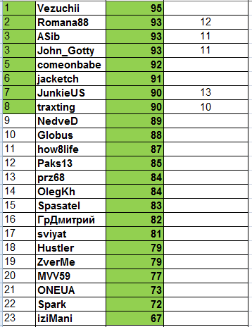 Предагаю вылетевшим с 9 по 16 места провести свой плей-офф, по правилам сновного турнира,исключив только доп форы за места. Скинуться по 20,и разыграть три приза(к примеру).Если кто то из 9-16 откажется,поднять вместо него другого участника с нижних позиций,составить сетку : 9место группы 1 с 16 местом группы 2,и так далее. Думаю и интерес будет,и опыт плей-офф на будущее пригодится)))).Либо, как альтернатива, взять еще двух и сделать для всех вылетевших,но для такого формата матчей маловато наверно,да и не всем наврено интересно будет. Если есть желание, давайте создадим отдельную тему и обсудим)