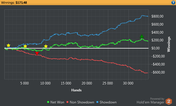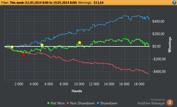 Отчёт за неделю. Во вторник взял занятие у Жана, сказать ничего не могу, так как одного занятия ОЧЕНЬ мало... но больше пока денег нет. Количество рук за неделю получилось меньше, чем хотелось бы. Во вторник не катал - вникал в теорию, в субботу не катал - был занят другими делами, сегодня покатал и аху..л, больше сегодня не буду, хватит с меня. Всего в этом месяце уже отыграно 54к., остаётся еще 46к, думаю до конца месяца успею. На след неделе постараюсь откатать 30к. Кстати после занятие с Жаном я с тал более широко открываться и количество рук/час уменьшилось соответственно, вместо 1000рук/час у меня теперь 800рук/час. Настроение ни к чёрту после сегодняшней сессии, надеюсь Металлист сегодня выиграет, а Днепр в свою очередь проиграет и уступит нам место в ЛЧ.
