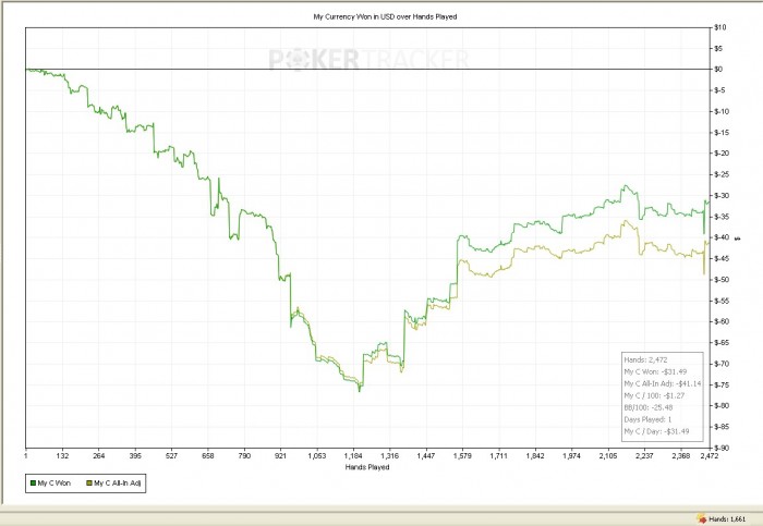 В момент такой раздачи я бы, наверное, проколлировал бы (полбанка - не так уж и много) для того, чтобы посмотреть на свою догадку (про дам) и понадеявшись, что мы все-таки впереди. Кстати, сегодня на терне сэт еле выкинул: неблефовый опп рейз дал, легла третья карта к флэшу.