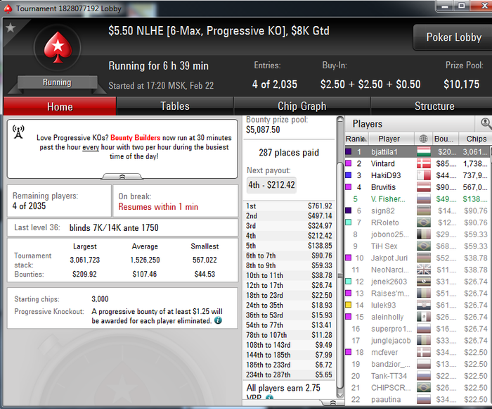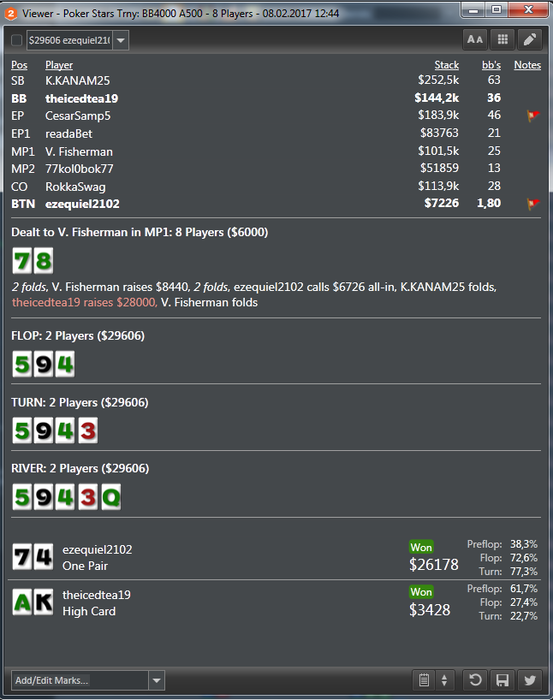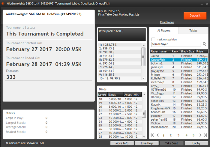 Закончил вчера выступление 20-ым в нокауте по 400$, было ощущение, что мой турнир, в топ 28 имел стек 60бб, сыграл несколько небольших раздач, где приходилось сдаваться и одну ключевую против непонятного оппа, по ощущениям фиш