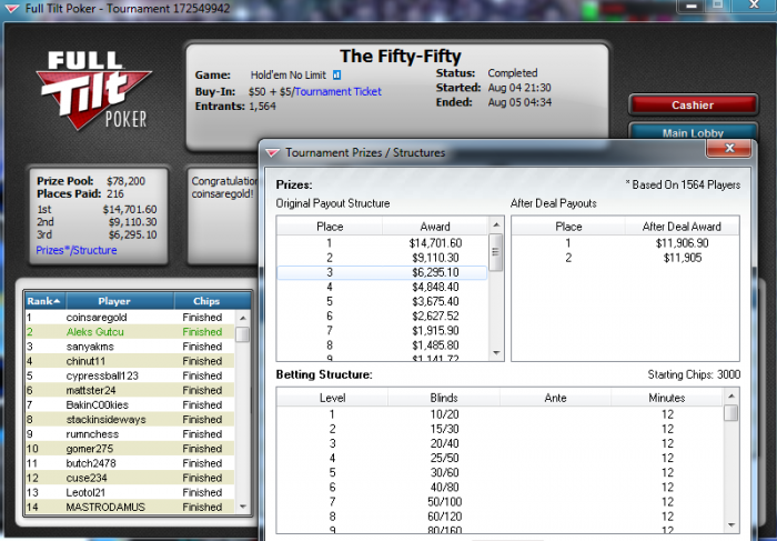 Ужасно отыграл фтопс,не попадание в доску + ща я переиграю и 1.5к от стэка,там и проиграл оллин JJ<A6s ФД и овер.Зато показал хорошую игру в фифти,начиная с топ150 где то играл отлично,правда отдал огромный стэк де профессионалу,поставив блэфовый 4бет в него=)но картина целиком не такая приятная как хотелось бы,в каких то туриках сыграл ужасно(точнл куплю се что нибудь что бы бить по пальцам),где то ауры не хватило.буду исправляться.
