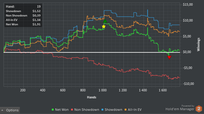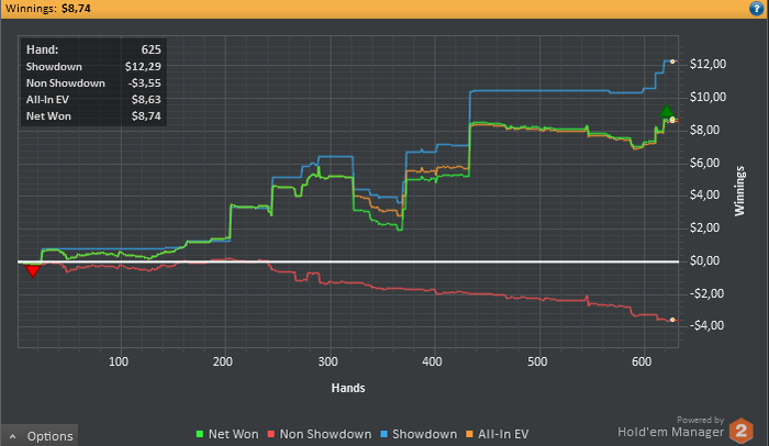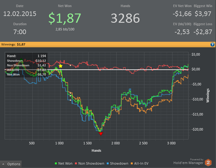 И вот только сейчас вытащил её в плюс - вот я лудоманище! Столько бабла слил на ошибках...Правда был период в сессии, когда выиграть ничего было просто невозможно: любая моя рука дохла на одной из улиц. Пробовал олынится - отвечала только рука лучше, вот я и затильтовал, думать стал меньше в 2 раза, появились дебильные коллы трибетов на префлопе с кармашами, коннекторами и т.д. Просто у меня были ещё дела недоделанные, а я сел "по быстрому плюсануть 3БИ и пойти по своим делам", бля. Вот это уже ошибка - с таким настроением садиться за столы нельзя. Постараюсь запомнить.
