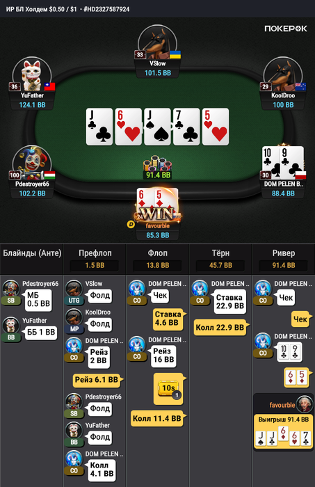 Первый выигранный неплохой банк на нл 100 на Покерке. Префлоп вообще не уверен, мы в дипах. С одной стороны вроде как по солверу пуш префлоп и погнали, с другой я не думаю что он 4бетит AJ,KQ, AQo с частотой. + Сайзинг низкий 4бета что склоняет к колу.