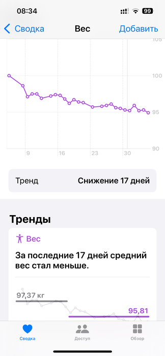 Ну и самое главное, весы передают данные в Эппл Здоровье автоматически. График выше - он как раз со "Здоровья"