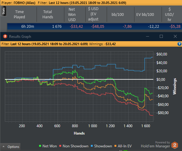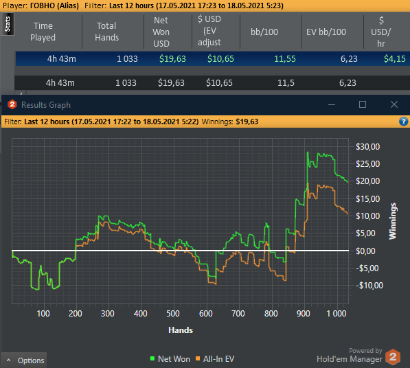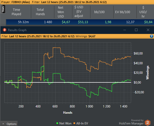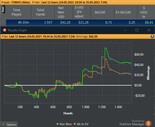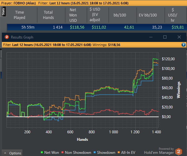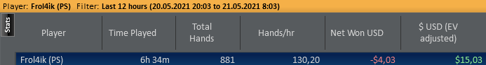 Если честно, то с 21ч до 22ч(по мск.), каталось не особо приятно. На пс випов было около нуля и меня это "моралило". Кое-как удалось найти пару столов, на них и апало. Я понимаю, что на дистанции, невозможно катать каждый день. Всегда будет форс-мажор. Не получится сыграть 30х5ч = 150ч. А 6ч очень проблемно катать в моём случае. Зачастую, смотрю в 3-4 утра на лобби старзов и понимаю, что не могу набрать и двух столов нл16-25 фр. Похоже, что надо еще пару румов подрубить.