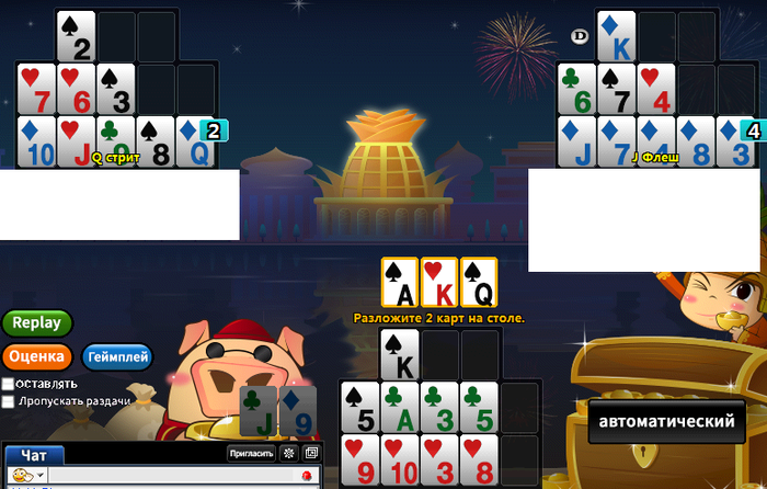 Gellemar, Я уже где-то писал, что свою игру в OFC я свел к некому алгоритму или десятку правил выведенных эмпирическим путем для принятия решений в спорных ситуациях, так вот в приведенном примере считать не вижу смысла(да я и не особо умею), т.к. одно из первых правил гласит "Не скупись, все остальное потом".