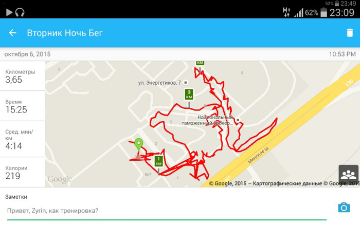 Ощущения: кажется, что пробежал меньше, чем вчера. Лишнего из себя не выжимал. Устал. Минут 30 болела голова, но уже вроде прошло. Стараюсь следить за техникой и дыханием. В целом нравится.