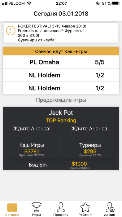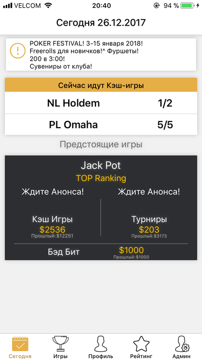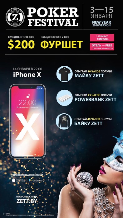 В Новом Году мы приготовили для Вас новогодний POKER FESTIVAL! Ежедневные фрироллы для новичков с гарантией 500$!* 200$ Каждую ночь в 3 часа! Фуршеты! На "Старый Новый Год" один из счастливчиков получит iPhone X! Дополнительные сувениры от клуба!