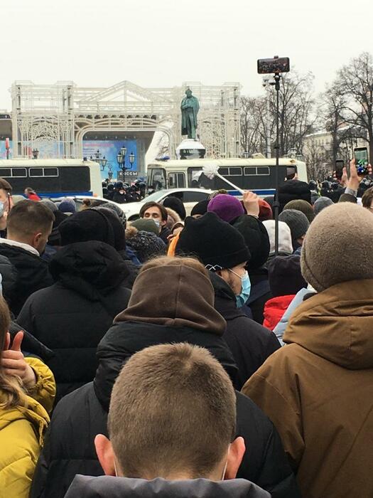 Москва гудела в прямом и переносном смысле. Особенно часов с 16 над всей Тверской стоял непрерывный гул поддержки сигналов машин. Причем клаксонили все – дорогие машины, дешевые, таксисты… Вот курьер на каблучке открыл окна, радостно бьет по рулю и машет демонстрантам, а вот какой-то толстяк на пассажирском сиденье черного майбаха (вот у кого уже видимо жизнь удалась:) тоже открыл окно и благодушно взирает на протестующих. С часу дня людские ручейки стекались на Пушкинскую площадь со всех сторон. Было много молодежи 20+, но не школьников (их накануне по всей стране успешно запугали). Пример? Утром 21 января звонит мне дочь 16 лет из Вологды: “Пап, прикинь, а у нас эту субботу сделали учебной! Сказали, мы от плана отстаем”. - А сколько уроков будет? - Ну 1 - 2 - А ко скольким приходить? - К 2 Это все говорит им классная (очень авторитетная у детей), потом отводит глаза в сторону и тихо добавляет: - Ну вы сами все понимаете… Потом появляется инфа, что в субботу с полицией будут проверять в школе, кто не пришел, а в пятницу вечером полиция для профилактической беседы приходит домой к знакомому мальчику, который просто подписан на группу берлинского пациента вконтакте. И такая фигня была по всей стране. Причем дети боялись не за себя, а просто не хотели подставить хорошего учителя или родителей.