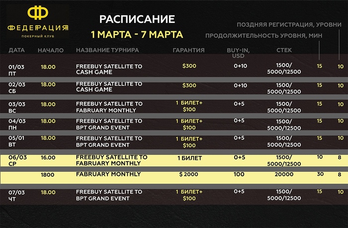 ВНИМАНИЕ!! В четверг 28 февраля в 18.00 состоится FREEBUY SATELLITE TO CASH GAME 150$ gtd Бай-ин 0+5$ Если вы делаете ребай в момент входа в турнир, то получаете стек 10000 фишек Стеки 1500/5000/12500 Уровни 15 минут Поздняя регистрация 10 уровней ГАРАНТИЯ 3 СТЕКА ПО 50$ Турнир пройдет на 1 столе, ожидается очередь