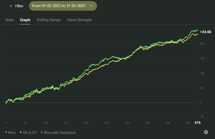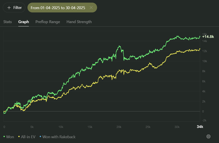 uebik798 @ 07.06.25Бомбпоты в алынах и всякие даблборды через раз трекает, и куча раздач где кто-то запушил свой стек 2бб и евшку посчитало для него, а не тех кто играл постфлоп.
