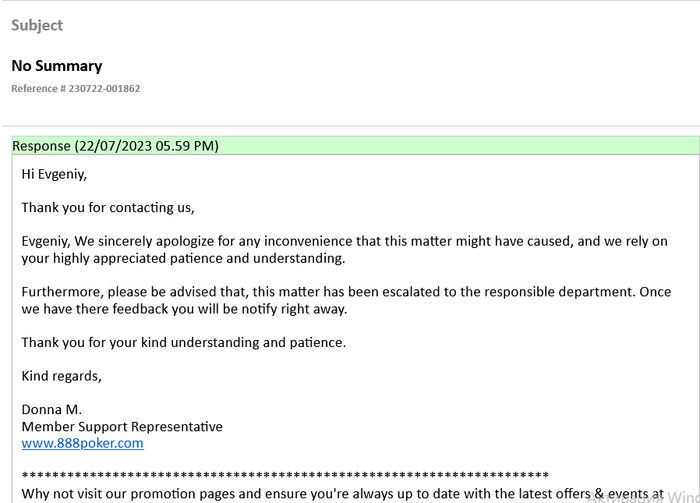 dvacuba @ 01.07.23Всем привет! Похоже пришло и мое время рассказать стандартную в этой теме историю про блокировку аккаунта по причине использования незаконного и неизвестного софта.Играл на 888 с 17го года снг, в прошлом году в сентябре начал играть в кэш, 130к рук в небольшой +. Была цель подняться до нл25, поэтому не кэшаутил и копил банкрол.Это была большая ошибка! На момент блокировки не счету было 780$. После первого письма счастья отписал в саппорт, что использую только разрешенный софт и прошу указать каким именно софтом, которым я пользуюсь, пользоваться нельзя.В ответ получил стандартное: к вам претензий нет, продолжайте , но больше так не делайте, а то... Явно попахивало шизофренией, гавном и кидаловом, нр я не обратил на это внимание и продолжил играть.Примерно через месяц прилетело второе предупреждение и тут я задумался о выводе денег...но не все так просто! В начале прошлого года я прошел верификацию аккаунта и получил письмо, что все ок. Но теперь оказалось, что мои документы не приняты... Вот это поворот!Хорошо, я начал верификацию по новой, но в этот раз с теми же документами все было уже не так гладко и им постоянно что=то не нравилось. Пока это все длилось, прилетело письмо с баном на месяц(. Я вежливо написал этим (*удалено оскорбление*), что это все мои деньги и вообще все, что у меня есть, что у нас война и это жизненно важно для меня.На что получил ответ, что они считают, что я больше не получаю удовольствия от игры, а их цель доставлять удовольствие и поэтому я не могу больше играть в их руме...Деньги пообещали вернуть, но эта бодяга длится уже больше 2х месяцев, саппорт кивает на охуенных профессионалов из отдела выплат и говорит, что не может никак повлиять на них.А охуенные профессионалы, получили давно все реквизиты Скрилл, которые просили и морозятся в тупую или обещают ответить за 72 часа...и морозятся в тупую.Не знаю чем это все закончится, но думаю, всем кто хочет начать играть на ГАВНОРУМЕ 888 будет не бесполезно принять к сведению и не держать там свой банкролл и не рассчитывать на этот скам, как на основной свой рум... ГАВНОРУМ 888 - (*удалены оскорбления*)