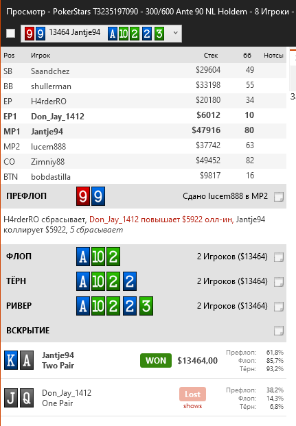 А ниже раздача с одним из форумчан. Смешанные эмоции. Это была решающая раздача. Опять же, сомневаюсь в правильности паса. Ну то есть, если бы нужно было коллировать только пуш ЛиберМаргинала, несомненно был бы колл. Но в раздачу залез еще один игрок, поэтому выбросила.