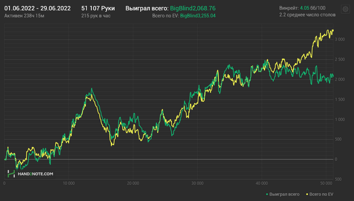 Вот моё Чико за последние пару месяцев, лимиты нл25-нл100, 100бб 6макс. Параллельно я еще экспериментировал в 20-50бб стеках на другом руме, но я не уверен, что это вообще билось в такой глубине с 11.5бб100 рейком, так что... ну вы понимаете...
