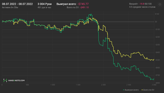 По своим меркам я неплохо играл большие банки, а сейчас смотрю раздачи и не понимаю, кто это вообще наисполнял) Там просто какое-то мясо с дикими велью овнами. Когда начинает трясти диспа, вылезает моё огромное слабое место - я чудовищно плохо чувствую тонкие изменения в относительной силе среднего велью, это какая-то катастрофа, я как корова на льду с этими парами. Бац - оверплейнул, бац - не доиграл. Вышел один тёрн, ну тут надо жарить плотно, вышел чуть иной и уже...