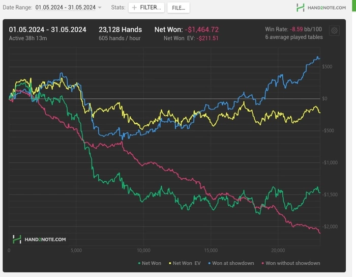Хорошо хоть с доп рб. По кассе -832. Игры хорошей стало значительно меньше. Мой первый минусовый месяц, но и дистанция так се. А еще в апреле почувствовав себя получше решил затестить сгонять в казино, помочичь ножки в 2/5 и мб если там лучше составы снять там комнатуху на лето и типо четверг-вск там и потом обратно в торонто. Стол был лучший что я когда либо играл в оффе, чел опен пушил КЖо, получал колы от 77. 2-3 средних рега. В целом топ катка, но меня в ней уебало прям без шансов на -1325, шо не так критично, учитывая как до этого меня апало, но я потом пришел в номер своего бомж отеля и просто не смог уснуть ни на час после 10 часовой катки. Поэтому решил что пока я окончательно не прийду в норму ментально и сон будет прям стабильно пиздатый буду катать онлине. Пока тестово в режиме днем спорт-прогулки, вечером 3-4 часа катки и в 11 спатки чувствую себя ок. Такой план на июнь пока, там посмотрим.