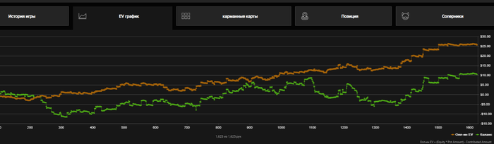 EV 11бб/100 — скромно. Снижение EVшки? Это не диспа, а пробы новых стратегий + куча мискликов. Если увидите, как я лезу префлоп с T6o — просто посмейтесь над моей криворукостью. Играю 9 столов стопкой, и иногда из-за смены окон или двойных кликов действия попадают не на те столы.