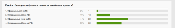 Впечатляющий разброс мнений от жителей РБ и не РБ. Любопытно, что даже на такой площадке с ультралиберальной ЦА как джипситим большинство небелорусов выбрали официальный флаг. Мое мнение тут на стороне большинства, а официальный белорусский флаг считаю самым красивым из постсоветских стран(ну с Туркменистаном боевая).