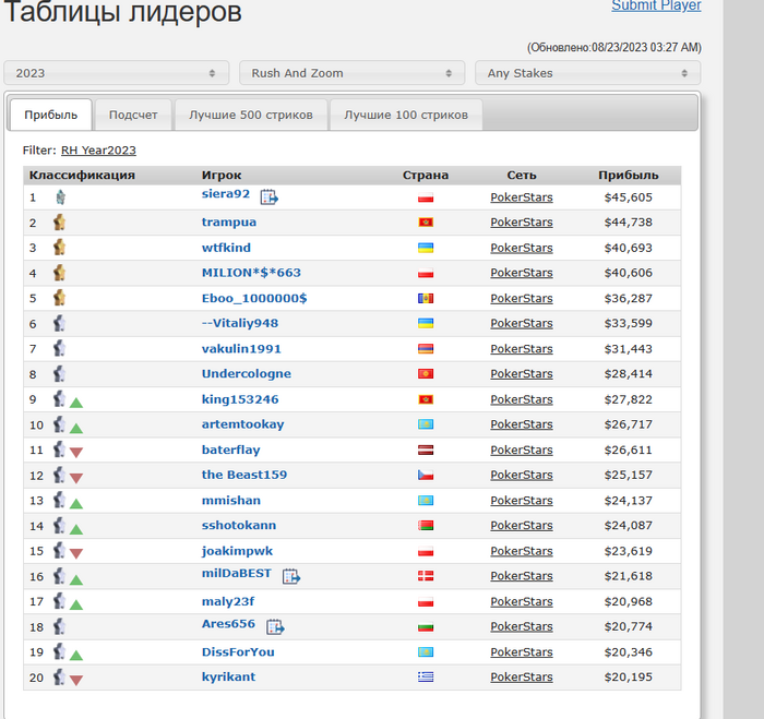 Узнал про существование общей таблицы тотал нок хедзапов, в ней иду 9-м за год. Что считаю не плохим резалтом, так как по количеству сыгранных турниров не вхожу даже в двадцатку и совмещаю с мтт загрузом в отличии от многих чисто хедзапных регов.
