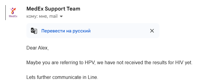 Прикладываю два скриншота сообщений из гмейла, как я узнал, что это всё тупая ошибка. Я написал им сообщение с просьбой отправить мне мой положительный результат на ВИЧ, а они ответили, что их сообщение было про ВПЧ.