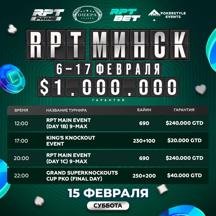 Доброе субботнее утро! БОльшая часть серии уже позади, а впереди 3 самых насыщенных дня. Все это время будем наблюдать за развязкой главного турнира серии RPT Prime — RPT MAIN EVENT. Турнир в первый же день собрал 264 входа, а ещё два флайта ждут впереди и два уровня поздней регистрации будет в объединенном дне. Этот турнир совершенно точно станет одним из самых масштабных в Минске!