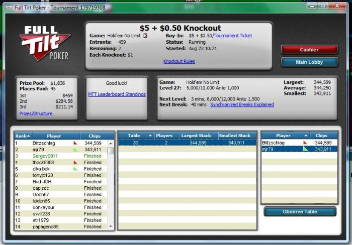 Full Tilt Poker $5 + $0.50 No Limit Hold'em Tournament - t150/t300 Blinds + t25 - 9 players -