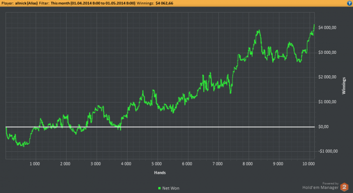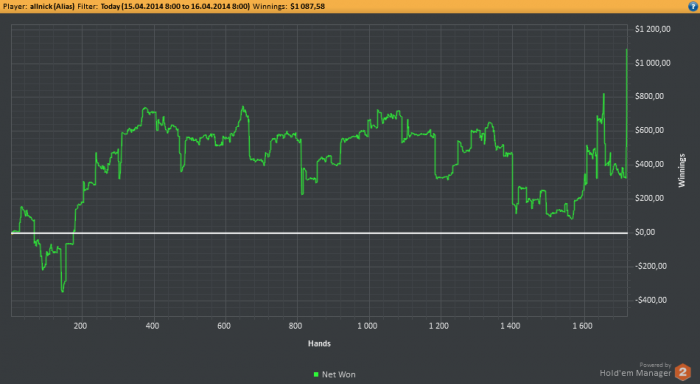 Приветствуются мнения по формату блога, удобно ли когда все в куче одним постом, и покер и оффтоп какой, и разбор раздач и графики. Для поддержания интереса думал снова ввести понедельные отчеты, но вроде итак нормально все.