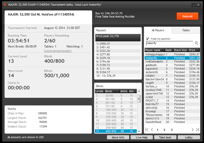 2. Poker Stars, $0.44 Buy-in (100/200 blinds) No Limit Hold'em Tournament, 5 Players