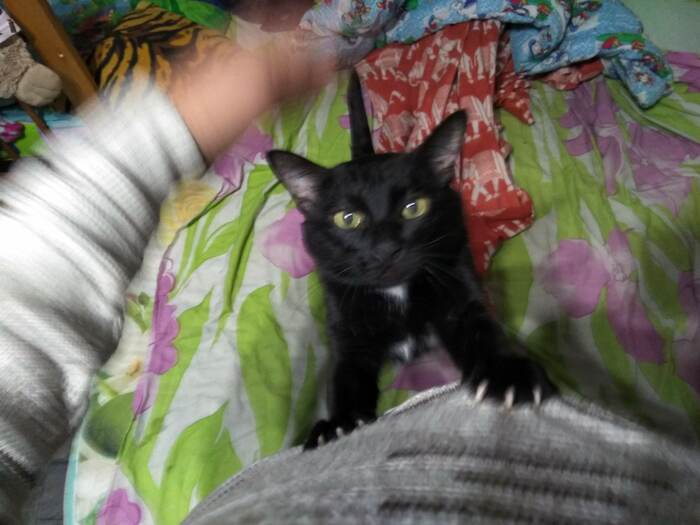 Первым выбежал крупный котенок, действительно полосатый, но скорее черно-рыжий. Ну не зря же шли, давайте его. Уже взяли его на руки, но тут выбежал еще один котенок, поменьше, с почти невидимыми полосами и почти чёрный. У обоих, кстати, белые пятна на груди и животе. Выбежал и стал активно вокруг нас прыгать.муж посмотрел на него, на меня и говорит : а давай его тоже возьмем. Я сначала сказала, зачем нам два, но муж убедил. Хозяйка сказала, что имен они им не дали, просто называют малышами. И сказала, что мало ли что - не выкидывайте котят, а верните нам).