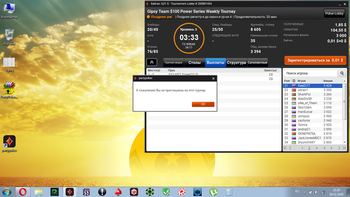 Блин обидно, у меня давно покерстарс стоит без кода регистрации и не могу в него играть во фрироллы, изначально шансы в лиге резко снижены из-за этого. На прошлой неделе третьим стал в редстаре думал стоит другие фрироллы играть и не пропускать, напоминалку поставил. А сейчас хотел в редстар турнир сыграть, так нигде не отображался фрирол, ни в браузере, ни в клиенте, через билет не заходил, а потом и регистрация кончилась, обидно:( Поддержка пишет в следующий раз заранее приходите, будем решать вопрос, на прошлой неделе еле успел зайти, смена браузера помогла, а на этот раз шиш. Обидно из-за технических проблем лишаться шанса, sad. Ну теперь за полчаса заведу напоминание, чтобы потратить его на общение с чатом поддержки, раз просто сесть и играть у них нельзя