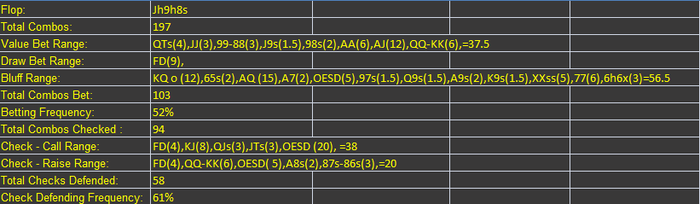 Это ну просто пиздец какая сложная тема. Выстроил только что спектр защиты SBvsBB на казалось бы простой доске и потратил где-то полтора часа. И когда выстроил спектр цбета 63% (20%велью\43%блеф) и спектр чека 37% (17% чек\кол, 20% чек\фолд)