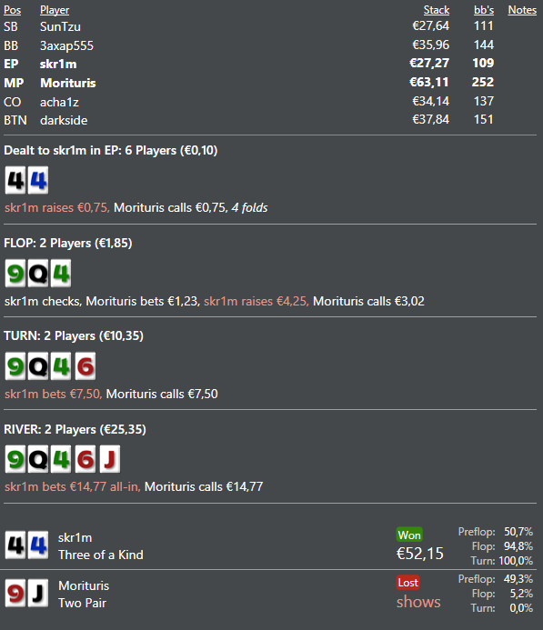 Вот одна из нестандартных для меня раздач. Раньше я бы никогда не чекнул бы дровянную доску без позиции с сетом, но сейчас понимаю что это не так уж и плохо(и не важно рег это или фиш, при условии что они не пассивные)