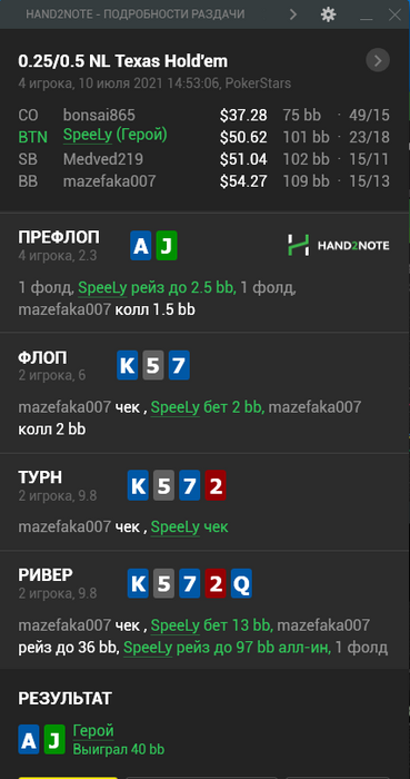 В четвертой раздаче. Отморозился и вколил? Ну с кем не бывает. Нахуя пушить флоп идеальную руку, чтобы нажать колл? Да, пол пота много, но ты и сам понимаешь, что там АК КК АА и ФЭ у тебя 0. Самое смешное, что даже если придумать туда блеф 1 комбу по А5, то она тоже не выкинет =) Жмакни колл, уеби доездом или сфолди терн, а потом культурно напиши в чат Pre Miss click, sorry =)
