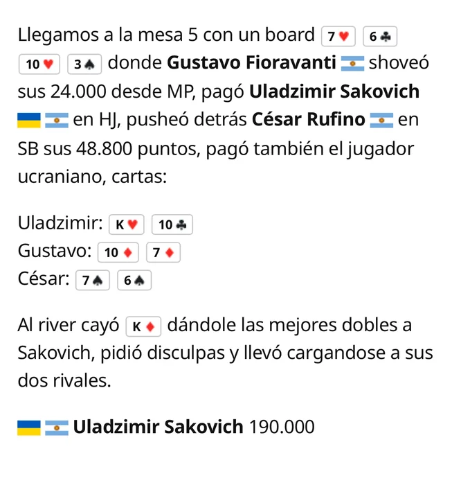 Мы подошли к столу 5 с доской [7 ♥️] [6 ♣️] [10 ♥️] [3 ♠️], где Густаво Фьораванти 🇦🇷 пошел олл-ин со своими 24 000 с MP, заплатил Уладзимир Сакович 🇺🇦🇦🇷 на HJ, затем запушил Сесар Руфино 🇦🇷 на SB свои 48 800 очков, заплатил также украинский игрок, карты: