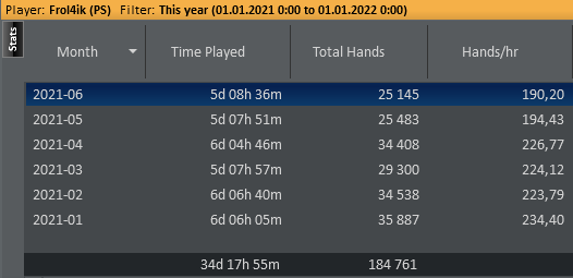 Получается, что 4 месяца 225hands/hour, а в мае все фишы вышли загорать.