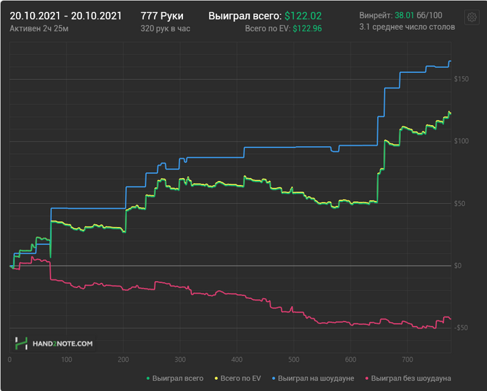 DmitryLove @ 20.10.21Если по серьёзке, красивые графики помогают ведению блога, наполняют его профильным контентом, визуализируют результат. Но у всего этого есть обратная сторона - быть result oriented на ультракоротких дистанциях - существенный околопокерный лик с которым нужно бороться, если не хочешь разъебать нервишки с кукухой. Радоваться дневному заносу как и печалиться заливу в рамках пары сессий - деструктивный подход, эмоции при работе с деньгами неприемлемы, имхо. Да ты и сам наверно это понимаешь
