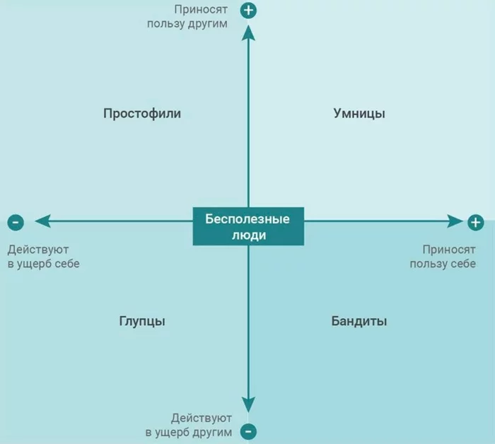 Умные люди приносят пользу обществу и себе. Преступники вредят другим и извлекают в этом пользу для себя. Есть люди, которые помогают другим в ущерб себе. Но только глупцы причиняют ущерб другим людям, не извлекая из этого никакой выгоды. Общество в целом приходит в упадок.