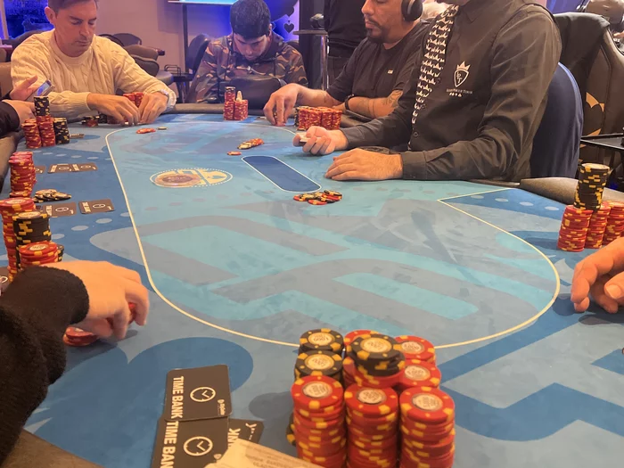 за столом осталось 4 сильных и дедуля с соплями, жду два стола чтобы хоть немного улучшилась ситуация( сильные с такими же стеками или больше)ток один половина среднего)